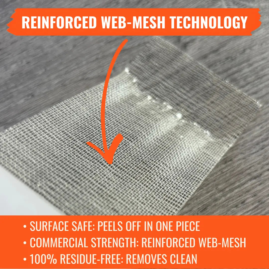 Reinforced web mesh technology - Comes up all in one piece - no shredding mess to clean up - commercial strength
